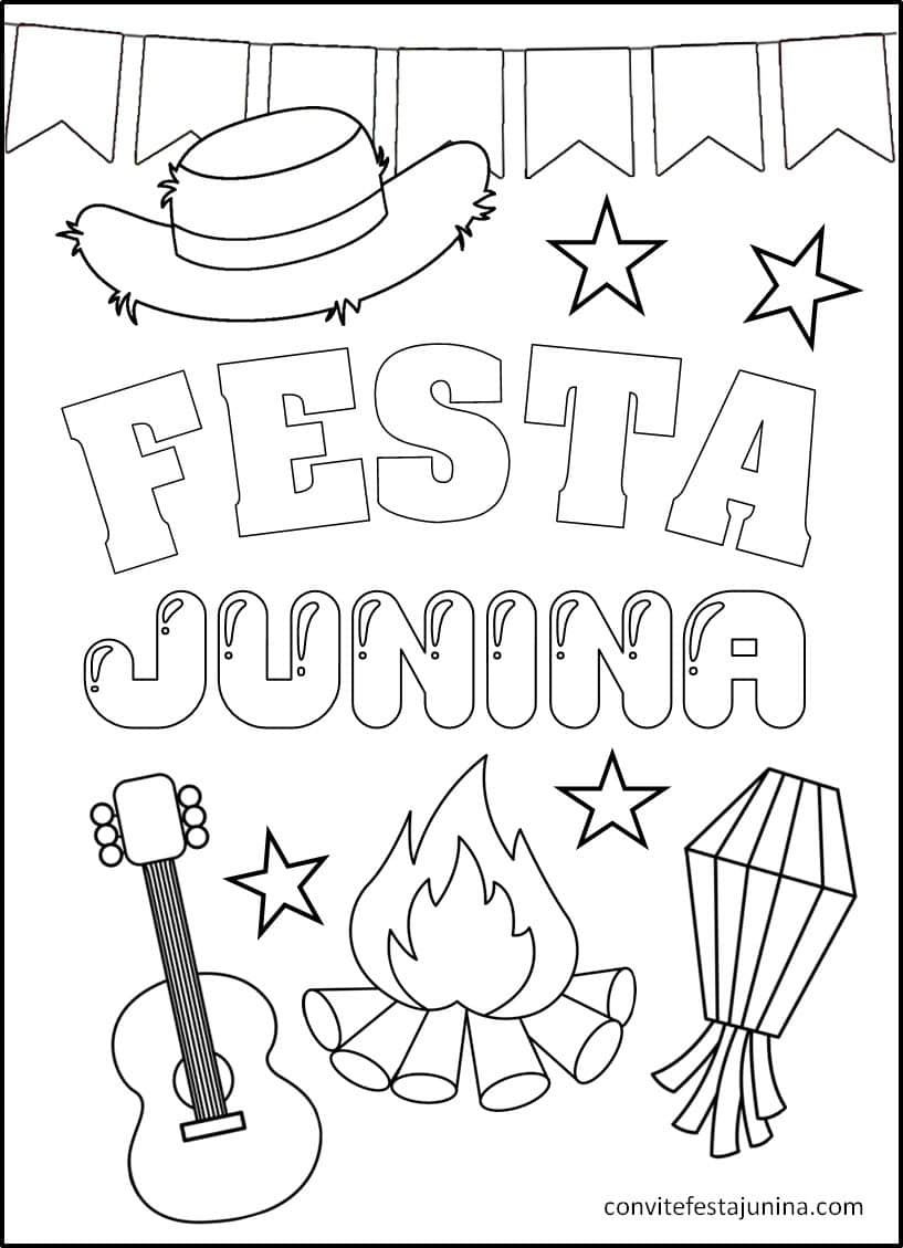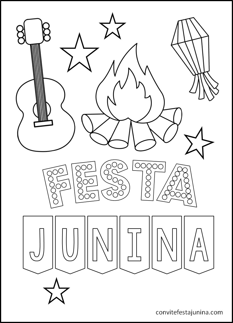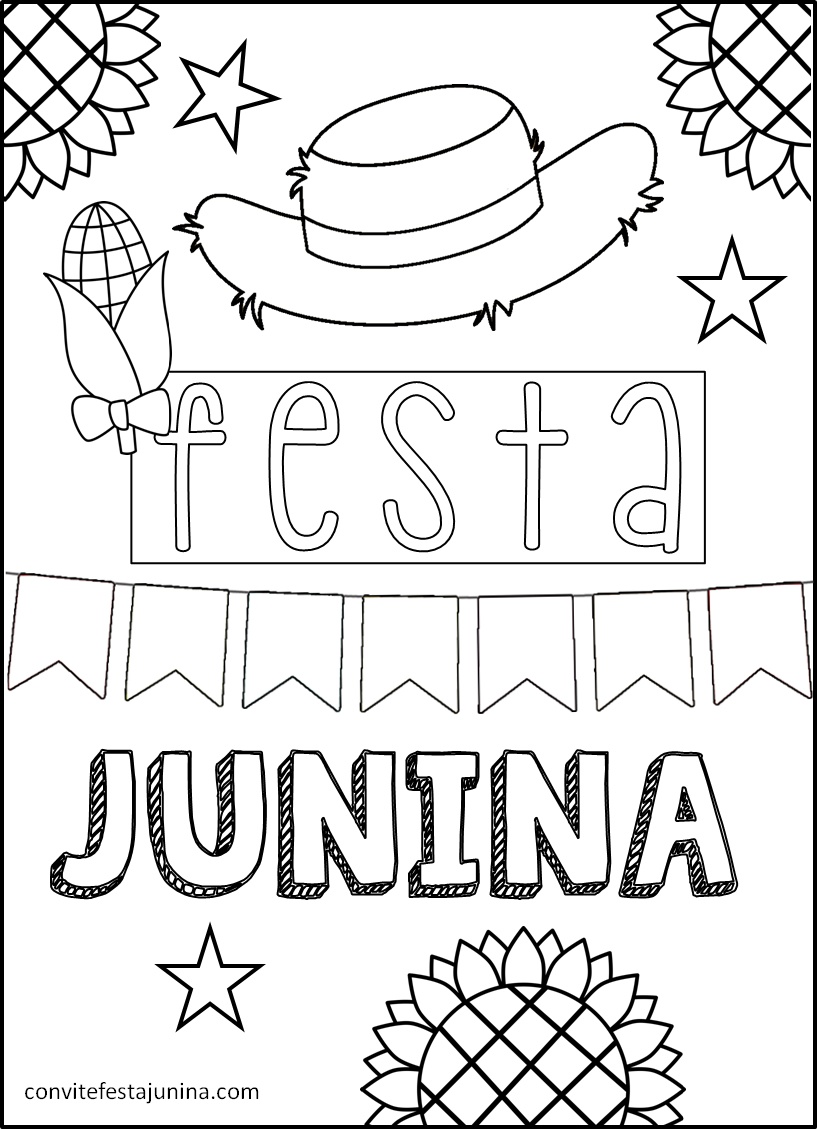 Temos a melhor coleção gratuita de imagens de Festa Junina para colorir. Meninos e meninas adoram tudo que tem a ver com a véspera de Festa Junina. Os mais pequenos adoram pintar com diferentes tipos de tinta, é um jogo muito divertido. É uma atividade perfeita para compartilhar com o seu filho, pintar as imagens de Festa Junina com cores será muito divertido. 1, 2 e 3 Vamos pintar! Quem gosta por Festa Junina sabe que é quase impossível escolher algo que seja melhor nessa época do ano. Que coisa mais linda que ter toda a familia a Fogueira acesa, milho na brasa, quentão no fogo e música caipira.